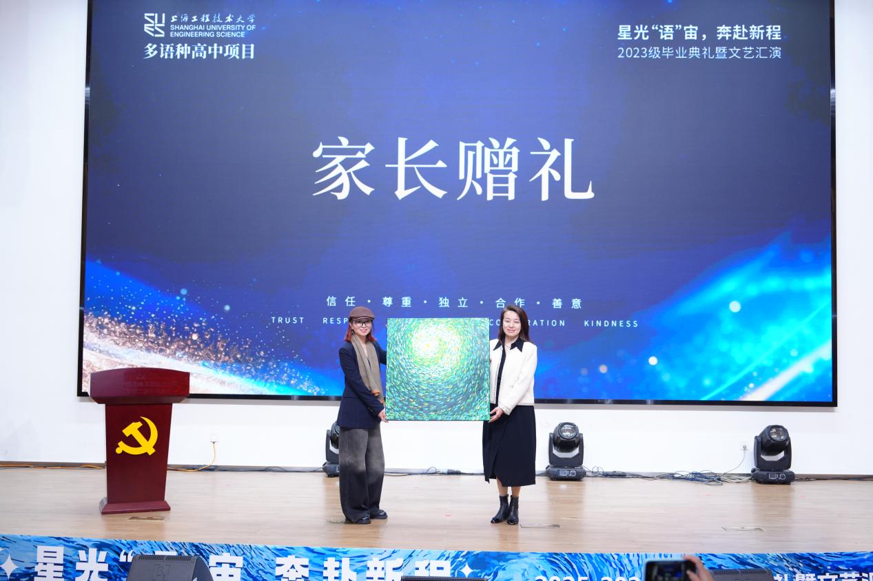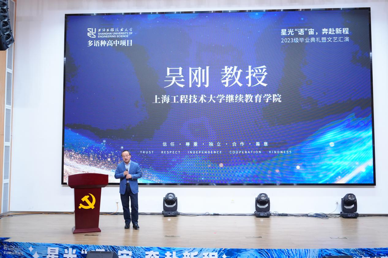 2025年12月18日下午,继续教育学院多语种高中项目2023级毕业典礼暨文艺汇演在上海工程技术大学长宁校区产教融合大楼报告厅隆重举行。本次活动以“星光‘语’宙,奔赴新程”为主题。继教产业联合党总支书记袁蓉教授、继续教育学院副院长(主持工作)吴刚教授及相关职能部门负责人、多语种高中项目全体师生与毕业生家长代表齐聚一堂,共同见证2023级学子完成高中学业,开启海外深造新征程。